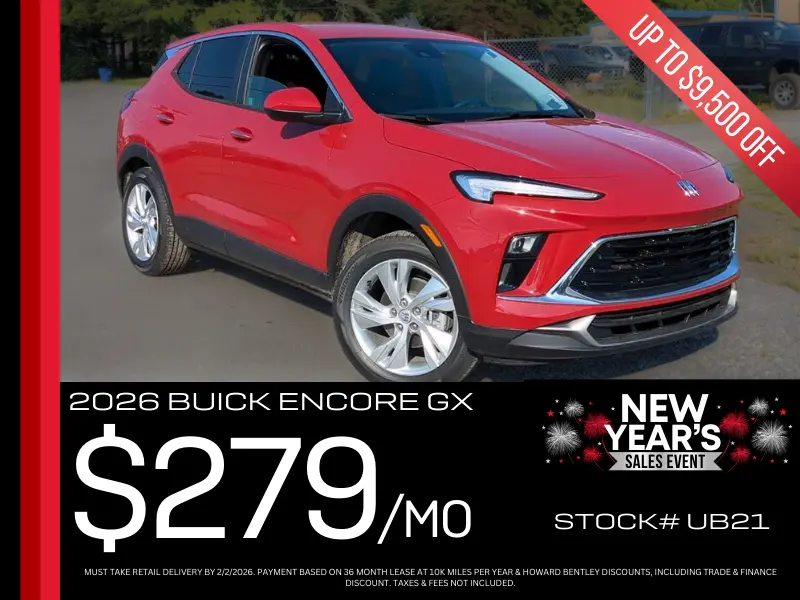 Only $298 per month. 2026 Buick Encore GX. Stock #UB21Must take retail delivery by 2/2/2026. payment based on 36 month lease at 10k miles per year & howard bentley discounts, including trade & finance discount. taxes & fees not included.
