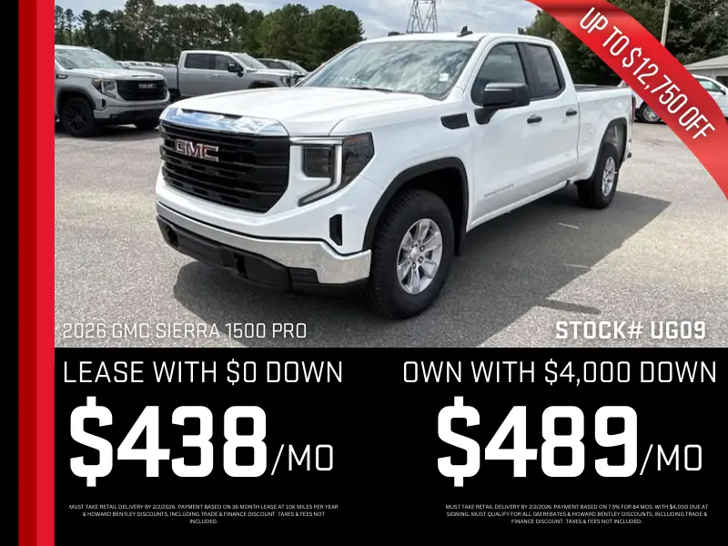 Lease for $434 per month, $0 Down. Own for $489 per month with $4000 down. 2026 GMC Sierra 1500 Pro.