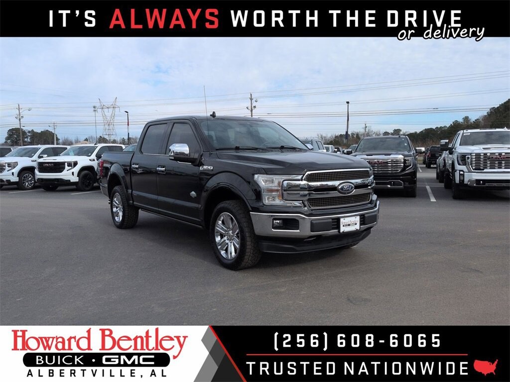 Howard Bentley Buick GMC is delighted to offer this stout 2020 Ford F-150 King Ranch in Black. Beautifully equipped with: Equipment Group 601A Luxury (20 Machined-Aluminum Wheels, Inflatable Rear Safety Belts, Multi-Contour Driver & Passenger Seats, Power-Deployable Running Boards, and Tailgate Step w/Tailgate Lift Assist), FX4 Off-Road Package (4x4 FX4 Off-Road Bodyside Decal, Hill Descent Control, Off-Road Tuned Front Shock Absorbers, and Tray Style Floor Liner), GVWR: 7,050 lbs Payload Package, King Ranch Chrome Appearance Package (Bright Belt Moldings, Chrome Door Handles w/Body-Color Strap, Chrome Skull Caps on Exterior Mirrors, Front & Rear Chrome Bumpers, and Wheels: 20 Chrome-Like PVD), King Ranch Monochromatic Paint Package (Painted Body-Color Wheellip Molding), Technology Package (360 Camera w/Split-View Display and Active Park Assist), Trailer Tow Package (Class IV Trailer Hitch Receiver, Engine Oil Cooler, Pro Trailer Backup Assist, and Upgraded Front Stabilizer Bar), 4WD, 10 Speakers, 18 Machined-Aluminum Wheels, 4-Wheel Disc Brakes, ABS brakes, Adaptive Cruise Control, Adjustable pedals, Air Conditioning, Alloy wheels, AM/FM radio: SiriusXM, Auto High-beam Headlights, Auto tilt-away steering wheel, Auto-dimming door mirrors, Auto-dimming Rear-View mirror, Automatic temperature control, Brake assist, Compass, Delay-off headlights, Driver door bin, Driver vanity mirror, Dual front impact airbags, Dual front side impact airbags, Electronic Stability Control, Emergency communication system: SYNC 3 911 Assist, Extended Range 36 Gallon Fuel Tank, Exterior Parking Camera Rear, Front anti-roll bar, Front Bucket Seats, Front Center Armrest, Front dual zone A/C, Front fog lights, Front License Plate Bracket, Front reading lights, Front wheel independent suspension, Fully automatic headlights, Garage door transmitter, Genuine wood dashboard insert, Genuine wood door panel insert, Heated door mirrors, Heated front seats, Heated rear seats, Heated steering wheel, Illuminated entry, Integrated Trailer Brake Controller, King Ranch Leather Bucket Seats, LED Sideview Mirror Spotlights, Low tire pressure warning, Memory seat, Navigation System, Occupant sensing airbag, Outside temperature display, Overhead airbag, Overhead console, Panic alarm, Passenger door bin, Passenger vanity mirror, Pedal memory, Power door mirrors, Power driver seat, Power passenger seat, Power steering, Power windows, Radio data system, Radio: B&O Sound System by Bang & Olufsen, Rain sensing wipers, Rear Parking Sensors, Rear reading lights, Rear seat center armrest, Rear step bumper, Rear window defroster, Remote keyless entry, Security system, SiriusXM Radio, Speed control, Speed-sensing steering, Split folding rear seat, Steering wheel memory, Steering wheel mounted audio controls, SYNC 3, Tachometer, Telescoping steering wheel, Tilt steering wheel, Traction control, Trip computer, Turn signal indicator mirrors, Twin Panel Moonroof, Variably intermittent wipers, Ventilated front seats, Voice-Activated Touchscreen Navigation, and Voltmeter!
